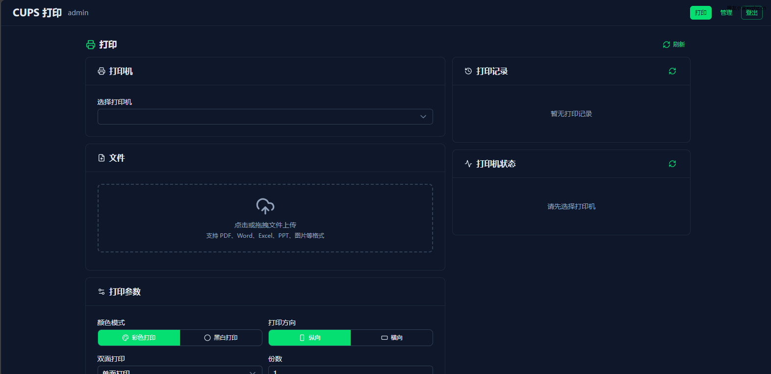 - 远程打印:随时随地通过网页上传文件进行打印